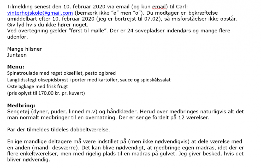 • Tilmelding til aftensmaden bedes ske til: