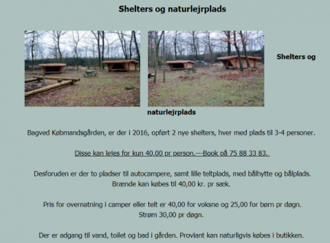 Hytten har køjer til 36 pers., 2 sheltere og område til teltopslagning.